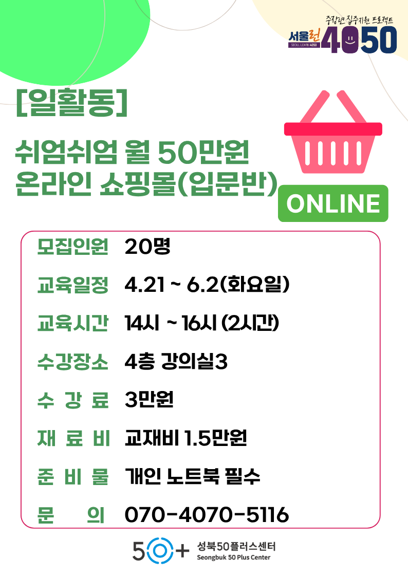 - “쉬엄쉬엄 월 50만원벌기 온라인쇼핑몰” 강의 // 노원50+ 외 2개소