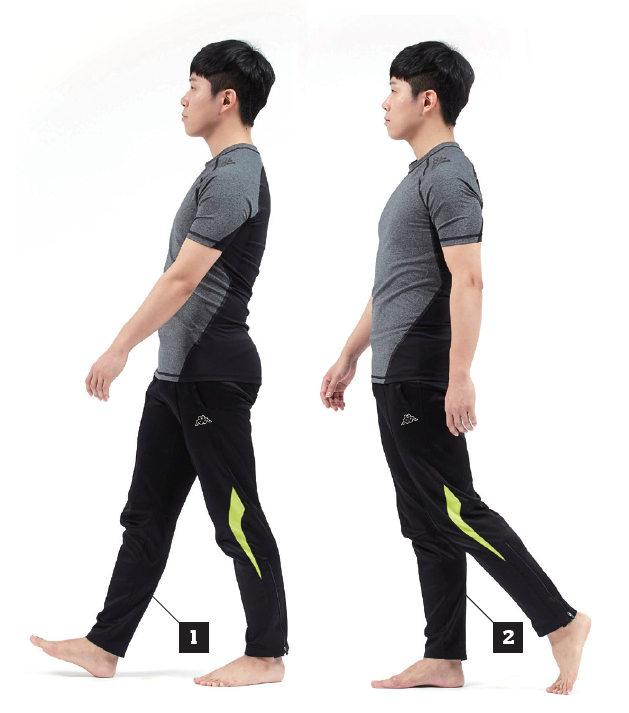 2. 팔을 가볍게 저으면서 발뒤꿈치부터 먼저 땅에 닿게 한다. 걸을 때 아랫배에 약간 힘을 주고 걸으면 허리 디스크 주위 근육을 수축시켜 디스크를 보호할 수 있다.
