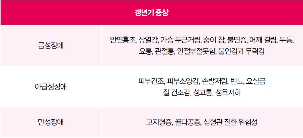 폐경으로 인해 여성호르몬이 결핍되면 안면홍조, 발한 등이 가장 많이 나타나고 심하면 피로감, 불안감, 우울, 기억력 장애 등도 동반된다. 비뇨생식기계의 위축에 따른 증상으로 질이 건조해지고, 부부관계 시 통증이 심해지며(성교통), 생식기 면역 저하로 질염, 방광염, 배뇨통, 급뇨 등의 증상도 나타난다. 또 피부 및 관절계에 변화가 오며 골다공증 진행이 빨라지고 피부가 건조하며 위축될 수 있어 노화를 체감하기 쉽다. 특히 급성으로 여성 호르몬 결핍이 나타날 경우 이러한 증상들은 폐경 약 1~2년 전부터 시작되어 폐경 후 3~5년간 지속될 수 있다.