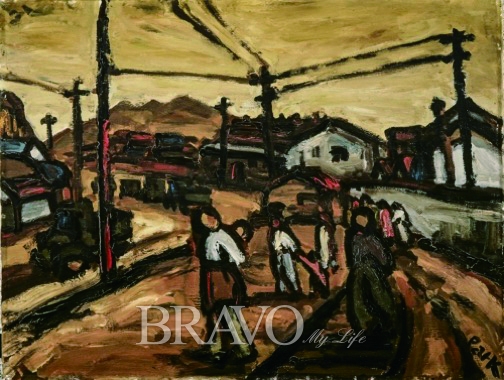 그의 힘 있는 필치에 익숙한 애호가들이 보기엔 분위기가 사뭇 다른 작품도 눈에 띄었다. 1951년 피란 시절 부산 범일동의 풍경을 화폭에 담은 작품이다. 그 시대의 어두울 수밖에 없었던 모습이 여과 없이 필자의 가슴을 파고들었다. 반추상적 터치로 그려낸 등장인물의 얼굴에는 웃음기가 전혀 없다. 참으로 마음을 무겁게 짓누르는 그림이다.[그림 2]