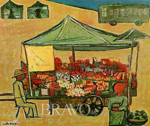 김환기 화백은 박고석 화백의 <범일동 풍경>에 비하면 아주 다른 세상을 화폭에 담았다. 캔버스에 등장하는 꽃수레 주인이나, 근처에서 무엇인가를 팔고 있는 여인의 표정에서 기다림의 마음을 느낄 수 있다. 그러나 화폭 중앙에 자리 잡은 꽃수레는 화사하고 다양한 꽃들로 가득하다. 주변의 인물상과 달리 수레 안의 꽃들은 세상이 어떻게 돌아가든 아랑곳하지 않은 채 화려하고 고운 자태를 뽐내고 있는 듯하다.