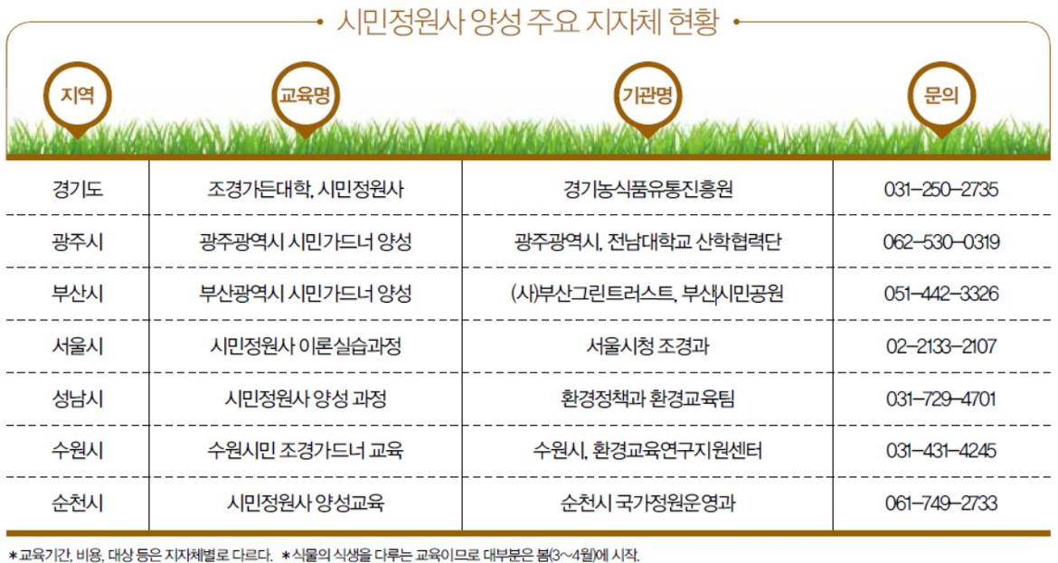 시민정원사 혹은 시민가드너 교육과정은 지자체별로 조금씩 다르다. 각 지자체별로 호칭도 다르고 교육시간이나 운영방식도 지역 현실에 맞추다 보니 제각각이다. 그러나 지역에 자원봉사 형태로 기여할 수 있다는 점은 대부분 비슷하다.