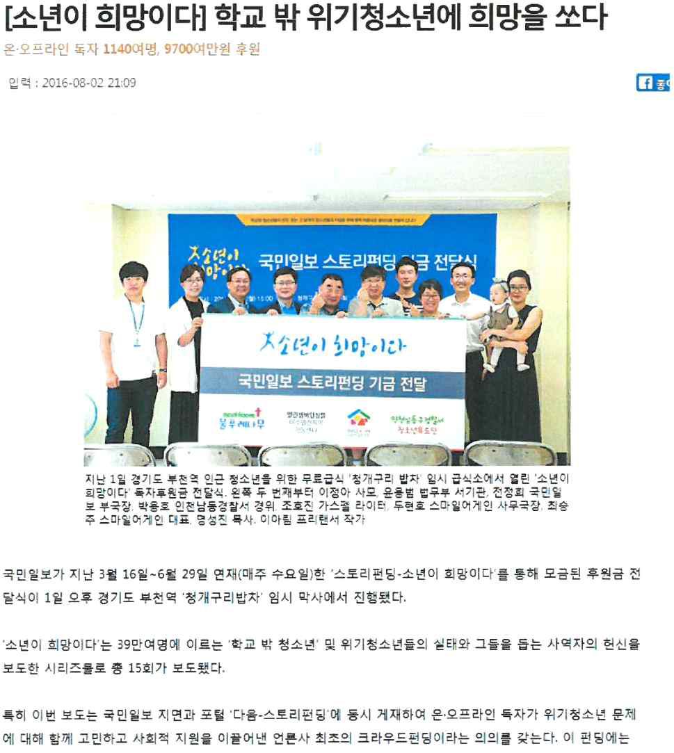 2016년 8월 2일자 <국민일보>의 <소년이 희망이다> 기금 전달 보도
