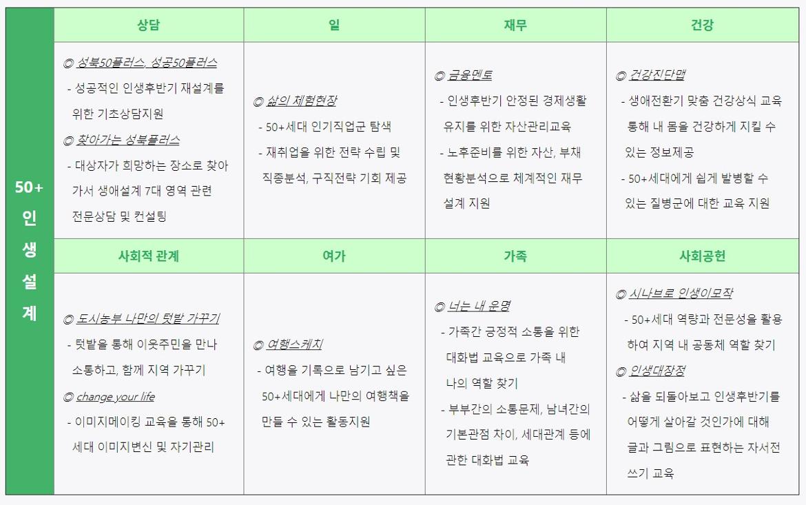 생애설계나 경력개발의 의미를 어떻게 설정하느냐에 따라 더 많은 기관과 프로그램이 이 같은 카테고리 아래 소개될 수 있을 것입니다. 특히 50+세대의 경우 정부에서 '신중년'을 새로운 정책 대상으로 설정하면서 다양한 지원 제도와 프로그램이 등장하고 있습니다. 운영 기관의 역량에 따라 프로그램 질의 편차가 존재하며, 기관에서 제공하는 프로그램의 질이나 정보 수준이 만족스럽지 못한 사례도 있을 것으로 생각됩니다.