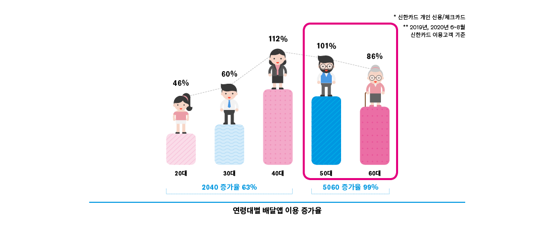 구체적인 수치를 살펴보면 5060세대 이용 증가율은 스트리밍 서비스 101%, 배달앱 99%로 2040의 이용 증가율인 71%, 63%보다 높게 나타났다. 업종별 이용고객 중 5060세대가 차지하는 비중도 소폭 증가한 것으로 나타났다. 젊은 취향의 시니어들이 스마트폰을 활용한 디지털 소비를 하며 집콕생활을 좀 더 스마트하게 즐기고 있다고 해석해 볼 수 있다.