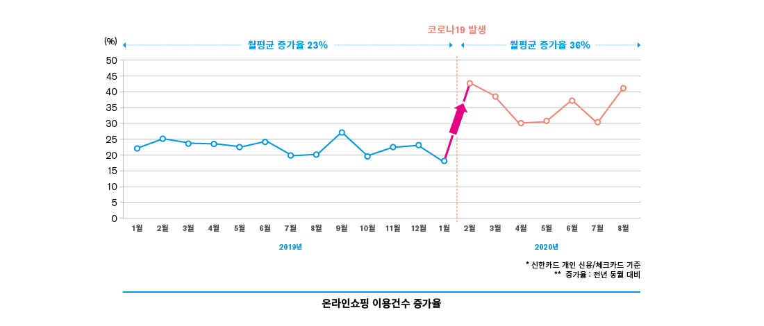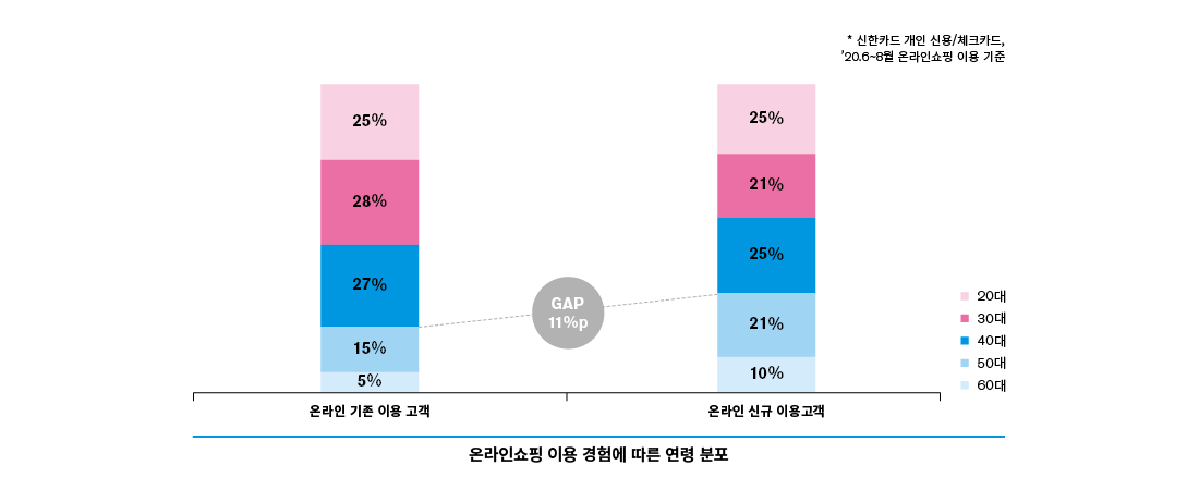 전 세계적인 감염병 이슈로 우리 일상에도 많은 변화가 나타나고 있다. 소비도 예외는 아니다. 일시적인 변화를 넘어 고객의 구매 시간 변화나 비접촉 형태의 구매 방식이 확산되는 등 큰 틀에서의 소비 패러다임이 변화하고 있다. 유통 업종을 중심으로 ‘집 밖의 소비’가 ‘집 안에서의 온라인 소비’로 전환되며 다양한 생활 영역에서 소비를 위한 물리적 공간의 언택트(Untact)화로 진행 중이다. 이 때문에 오프라인을 중심으로 주말에 소비가 집중되던 업종에서는 요일 구분 없이 온라인을 통해 상시 구매하는 형태로 소비 패턴이 바뀌었다. 소비 생활 전반에 대한 디지털화가 가속화되고, 디지털 경험 고객이 증가하고 있는데, 특히 5060세대의 소비 변화가 주목할 만하다.