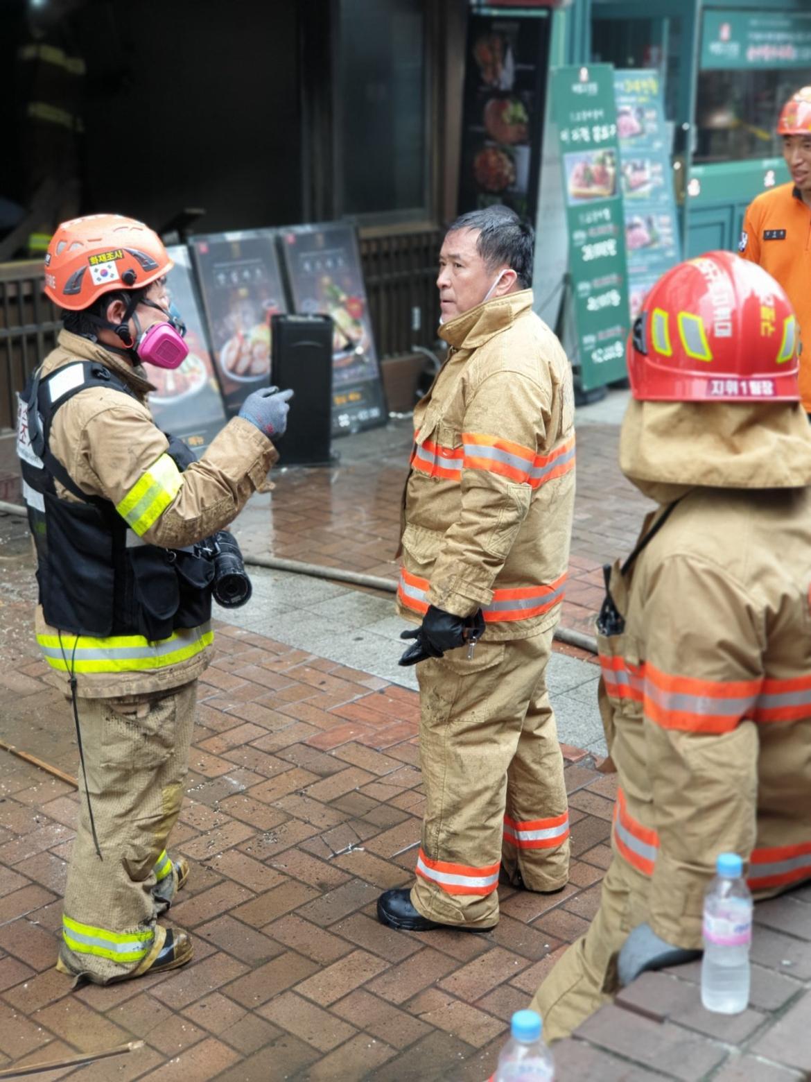 2020년 5월 2일 서울 구로동 코오롱사이언스밸리 지하 1층 음식점 화재 현장에서 김화신 진압대장의 지휘 모습.