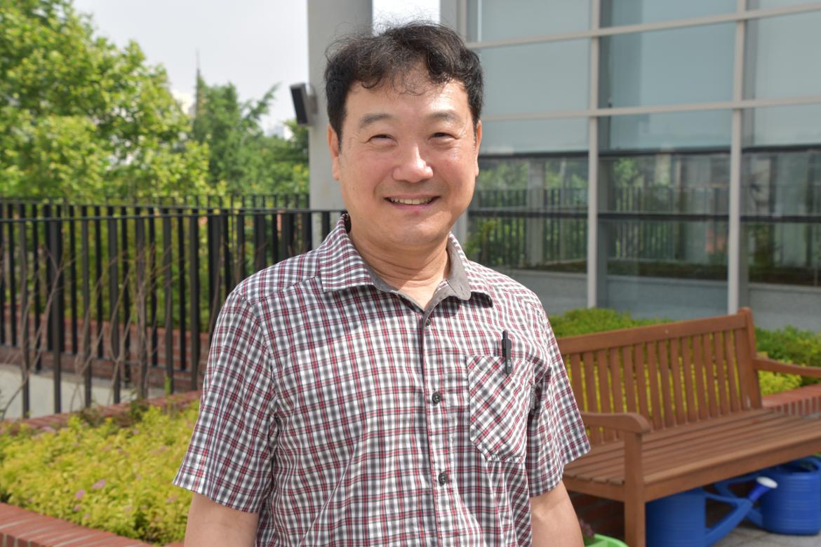캠퍼스 내부 정원을 돌아보고 계신 선생님 한 분이 보입니다.