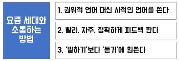 이렇듯 기성세대와 너무 다른 특징을 가진 요즘 세대와 어떻게 소통해야 할까? 기성세대가 옳다고 생각했던 소통 방식이 통하지 않는 경우가 많다. 그럼 어떻게 해야 할까? 세 가지를 제안하고자 한다.