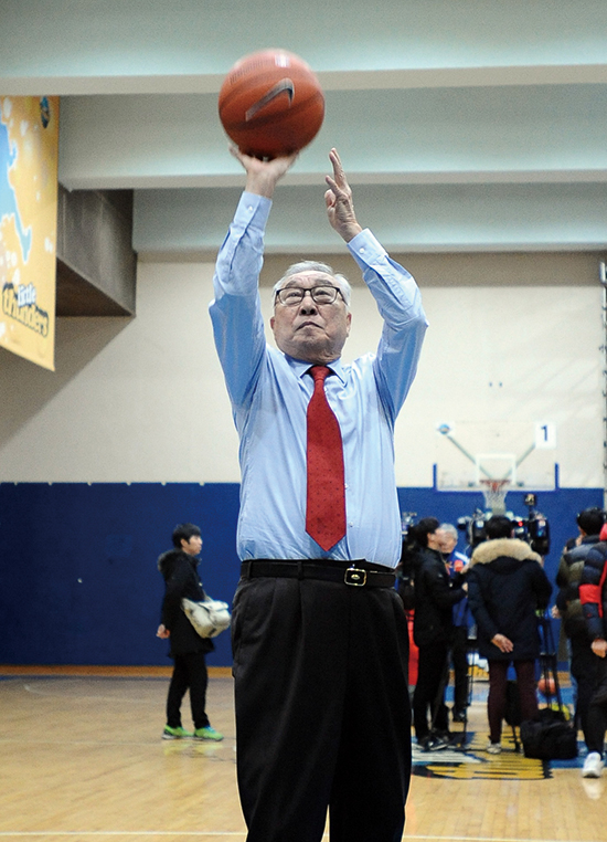▲2015년 1월 8일 서울 잠실실내보조체육관에서 자유투 연습을 하는 KBL 김영기 총재.