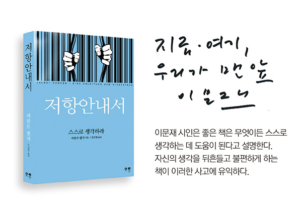 이문재(李文宰·57) 시인 겸 경희대 후마니타스칼리지 교수는 2014년 <지금 여기가 맨 앞>을 펴내며 이런 말을 썼다. ‘시란 무엇인가라고 묻는 대신 시란 무엇이어야 하는가라고 물었다. 시가 무엇을 할 수 있는가라고 묻지 않고 시가 무엇을 더 할 수 있는가라고 묻곤 했다. 시를 나 혹은 너라고 바꿔보기도 했다. 나는 무엇이어야 하는가. 우리는 무엇을 더 할 수 있는가. 그러다 보니 지금 여기 내가 맨 앞이었다.’ 지금 여기 맨 앞에 선 그는 <저항안내서(하랄트 벨처 지음)>를 통해 실천하는 지성의 중요성을 이야기한다.