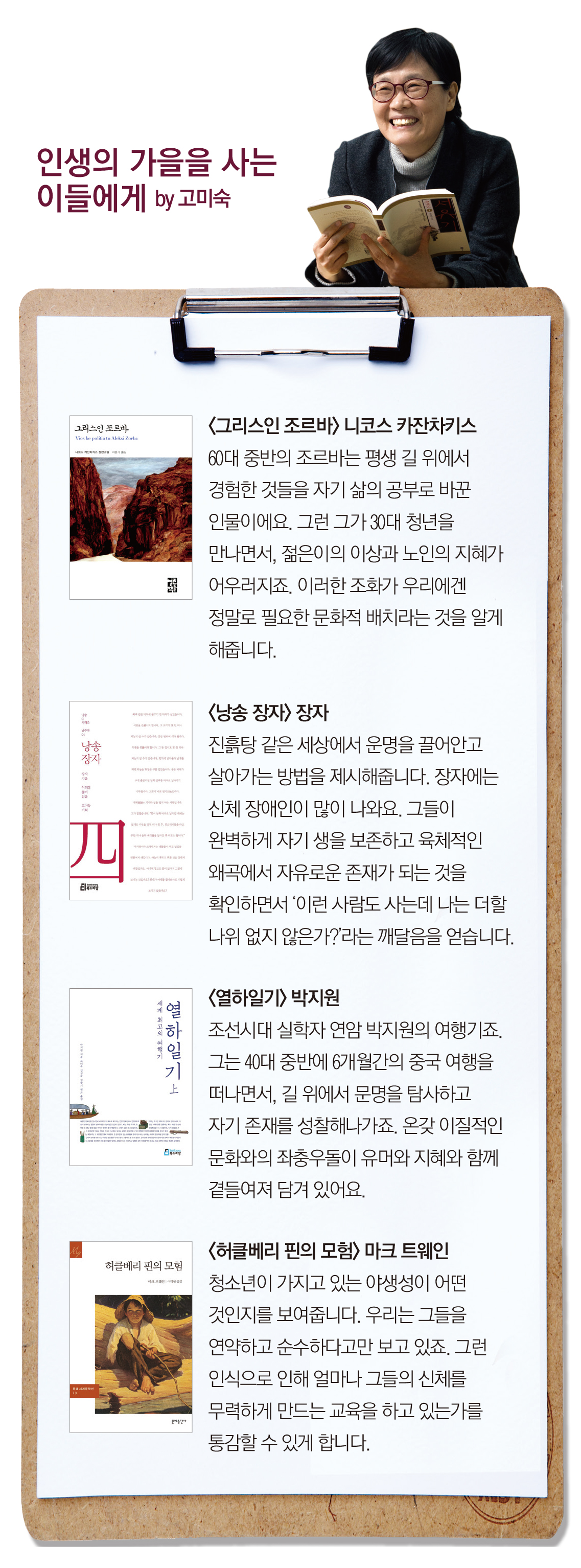 그녀는 중년을 가을이라 표현한다. 인생의 봄, 여름을 지나 겨울을 가깝게 느낄 수 있는 만큼 삶 전체를 아우르는 힘이 생기는 시기라는 것. 그렇기 때문에 그 어느 때보다 자신을 구원할 수 있는 공부를 해야 한다고 설명한다.