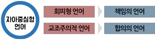 둘째,자아중심형 언어이다.상대방의 상황이나 입장을 헤아리지 못하고 일방적으로 자신의 견해를 전달하는 것이다."당신이 책임질 거야?" 결정적인 순간에 은근슬쩍 발을 빼는책임회피형 언어가대표적이다."괜찮아, 실수할 수도 있지 뭐." 젊은 세대와 소통하기 위해서는 새로운 시도와 실패를 독려하는'책임의 언어'가 필요하다.자아중심형 언어의 두 번째는 "내 말대로 해." 자신의 사고 틀에 갇힌교조주의적 언어이다.“이렇게 해보면 어떨까?" 젊은 세대와 소통하기 위해서는 공감대를 끌어내는‘합의의 언어’가 효과적이다.
