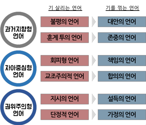 첫째,과거지향형 언어이다.현재나 미래보다는 자신이 경험한 과거의 기준과 규칙에 비추어 얘기하는 것이다.대표적인 것이 불평의 언어이다. "요즘 사람들은 말이야…" 과거를 기준으로판단하고부정적인말을 하는 것이다."이렇게 해보는 건 어때?" 젊은 세대와 소통하기 위해서는 잘못이 있다면 인정하고, 가능성을 찾아가는‘대안의 언어’를쓸 필요가 있다.과거지향형 언어의 또 하나는훈계 투의 언어이다."다 너 잘되라고 하는 소리야." 젊은 세대는 주제넘게 간섭하는 말에 예민하다.그들은 참견하는 조언자가 아니라 마치 엄마처럼 진솔한 소통의 파트너를 원한다.젊은 세대와소통하기 위해서는 동등한 입장에서 상대를 위하는‘존중의 언어’가 효과적이다.