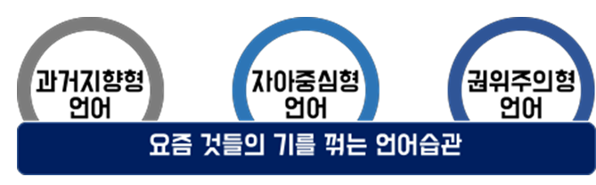 여러분의평소 언어 습관은 어떤가?누군가는 “꼭 그렇게까지 신경 쓰고 맞춰야 하는가?”라고물을 수도 있다. 필자의 대답은 일관되게 ‘그렇다’일것이다.젊은 세대와 기성세대는 많이 다르기 때문이다.단적인 예로 어려서부터 컴퓨터와 인터넷을 경험한 세대와 그렇지 않은 기성세대는 상당한 차이를 보인다.인터넷이나 SNS 환경에 익숙한 젊은 세대의 경우 기성세대보다 수평적이고 평등한 소통을 원하며 개인적인 성향이 강하다.수직적인 상하 관계에 익숙하고 예의와 관계를 중시하는 기성세대 측면에서 보면 젊은 세대는 똑똑해 보일 수도 있지만 당돌하고 버릇없어 보이기에 십상이다.반면 젊은 세대 입장에서 보면 기성세대는 경험이 많아 지혜로워 보일 수 있지만, 왠지 답답해 보일 수 있다.