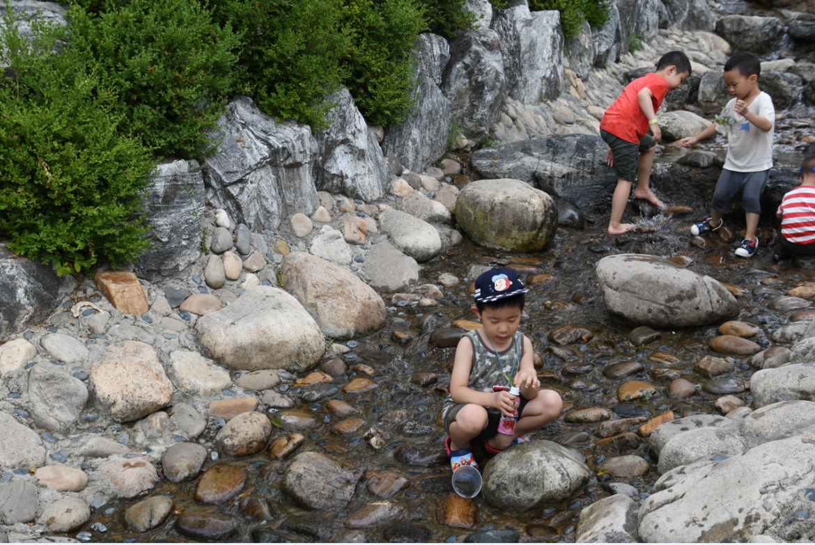 동굴 입구에 다다르니 동굴 안에서 흘러내려오는 시원한 물이 실개천을 이루고 있었다. 이곳에는 아이들이 더위도 잊고 즐겁게 물놀이에 집중하고 있어, 보는 이로 하여금 미소를 머금게 만들었다.