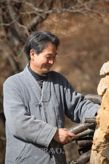 ▲흙집은 전통방식인 아궁이로도 난방이 가능하다. 장작을 살펴보고 있는 고제순 원장
