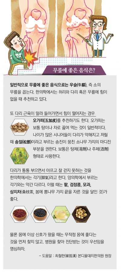 “퇴행성관절염을 악화시키는 주요 원인 중 하나는 체중입니다. 몸무게가 많이 나가면 그만큼 무릎에 가해지는 부하도 커질 수밖에 없으니까요. 체중 1㎏을 감량하면 실제로 무릎에 가해지는 하중은 3㎏정도 줄어든 효과를 볼 수 있을 정도입니다. 걱정 중 하나는 최근 시니어들 사이에서의 운동 열풍입니다. 등산과 걷기가 유행처럼 퍼져나가고 있는데, 본인의 몸 상태에 맞게 적당히 조절할 수 있어야 합니다. 만약 무릎에 통증이 느껴지면 충분한 휴식을 취하고, 그래도 통증이 계속되면 반드시 병원을 찾아야 합니다. 무릎과 관련해선 근육 강화효과는 거의 없습니다. 아플 때는 운동으로 이겨내려 하지 말고 휴식과 치료를 권합니다.”
