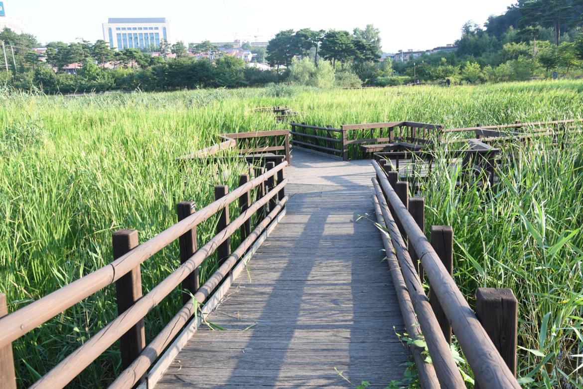저수지를 지나 항동 철길과 만나는 쪽문으로 향해 가면서 천천히 수목원을 감상해봤다. 저수지와 인접한 곳에는 수생식물원이 위치하고 있는데, 이곳은 갈대 숲 사이로 테크로드가 설치되어 있어 습지 위를 걸으며 수생식물들을 가까이에서 볼 수가 있었다. 먼발치에서는 보이지 않았던 연꽃도 비로소 연잎 사이사이에서 보였다. 무성한 갈대숲에서 불어오는 바람은 무더운 날씨를 잠시나마 잊게 해주기도 했다.