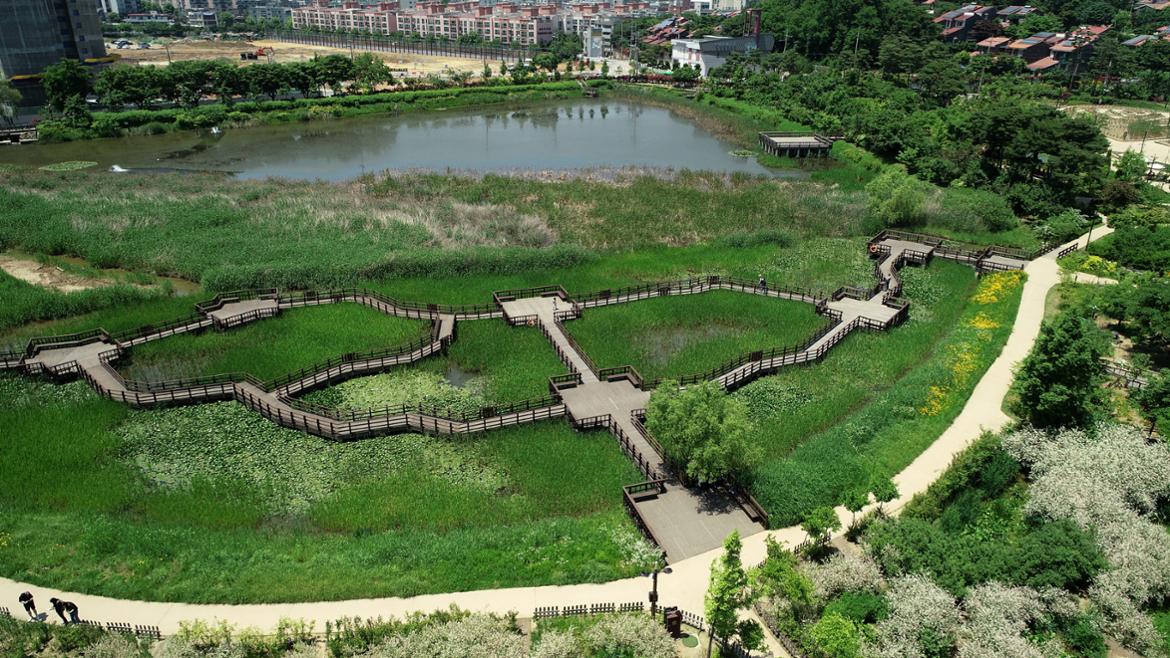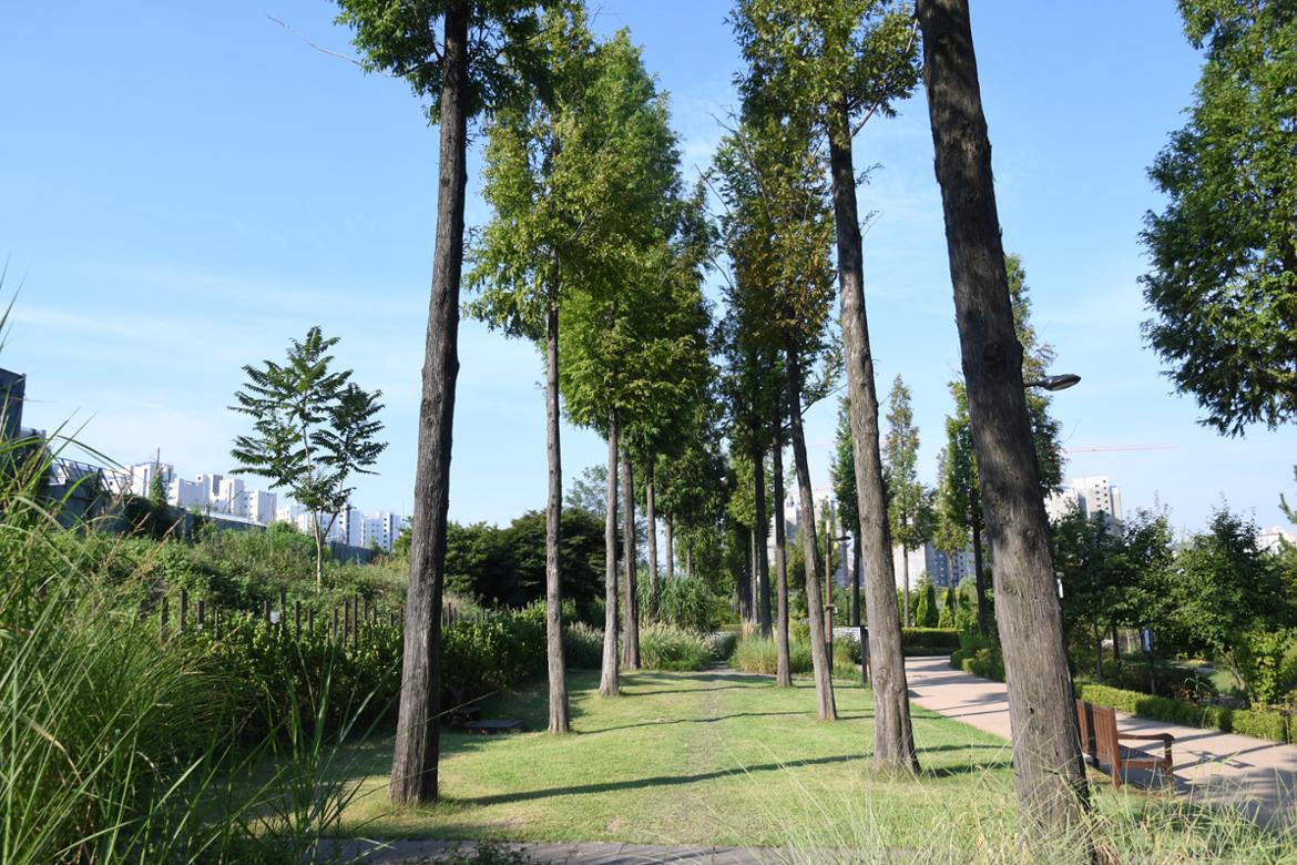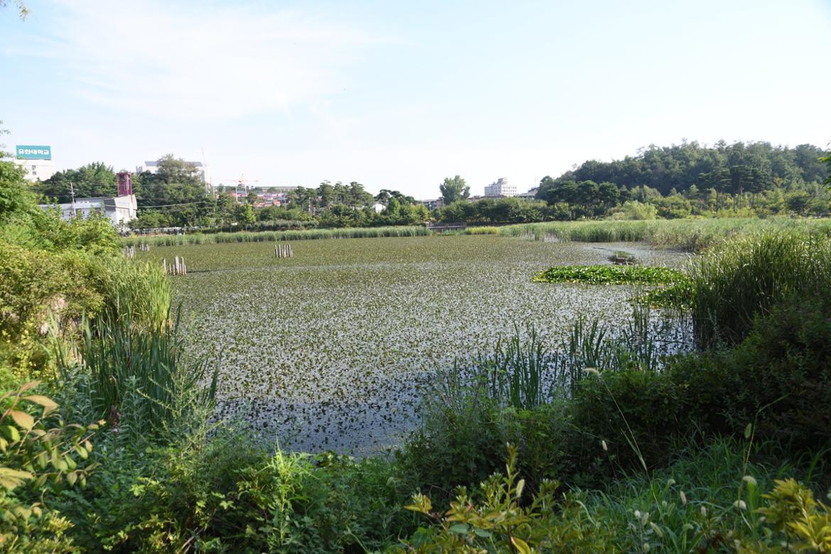 잔디광장 뒤편으로는 기존의 항동저수지가 자리 잡고 있는데 연잎이 빼곡하게 채워져 있다. 저수지 둑에서 서서 멀리 바라보아서인지, 시기를 놓쳐서인지 연꽃은 보이지 않았다. 가까이 다가갈 수만 있다면 연잎사이에 숨어있는 연꽃을 찾아 볼 수도 있을 텐데 하는 아쉬움이 남았다.