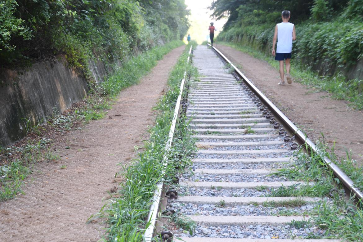 원예체험장에서 자라고 있는 수세미, 가지, 고추, 땅콩 등을 바라보며 발길을 옮기고 있노라니 어느덧 목표했던 항동 철길과 만나는 쪽문에 닿았다. 철길은 오류역에서 출발하여 시흥시에 소재한 어느 공장으로 연결되어 필요할 때만 화물차가 운행되는데, 사람의 발길이 적은 시흥시 방향으로 철길을 뒤덮고 있는 잡초로 미루어 봤을 때 최근에는 차량이 거의 운행되지 않는 모양새다. 반면 오류역 방향으로는 철길 옆으로 편하게 걸을 수 있도록 인도가 조성되어 있어, 몇몇 사람들이 인도를 따라 걷고 있었다.