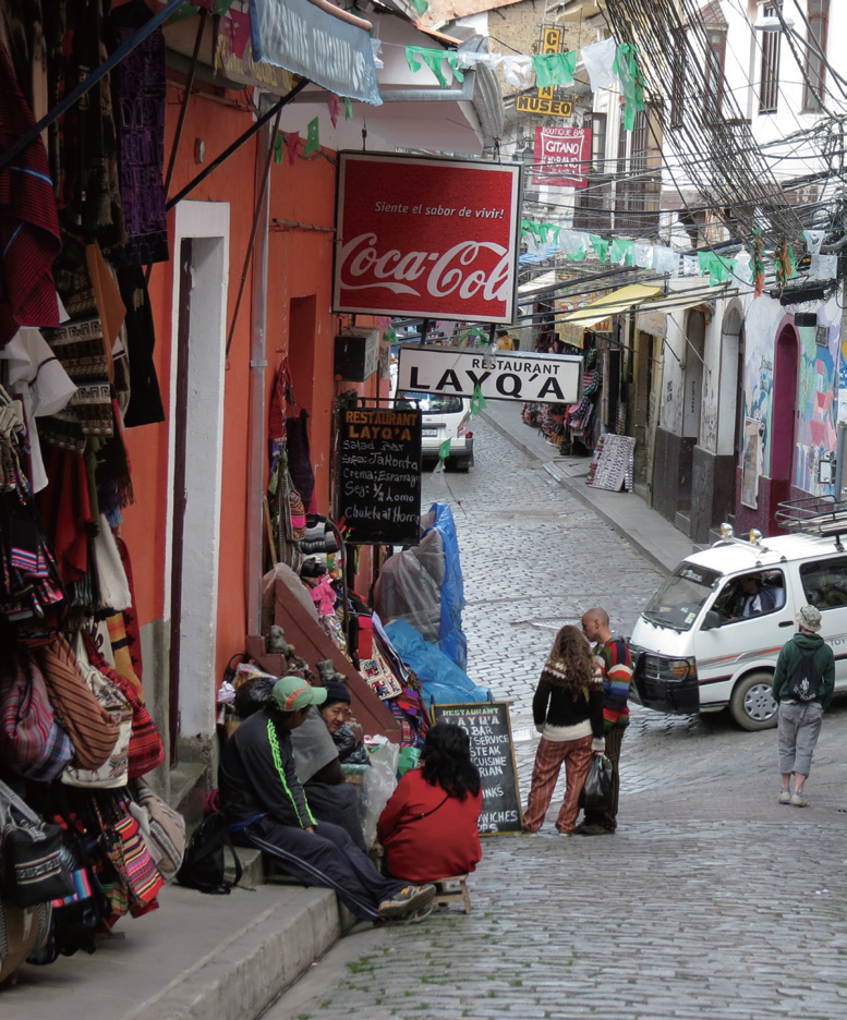 대표적인 사가르나가 거리 골목에는 안데스 특유의 패브릭과 장신구들을 파는 가게가 즐비하다. 재래시장은 사람 사는 냄새가 물씬 풍긴다. 안데스의 분위기를 물씬 풍기는 모자를 사서 쓰고 나니 금방이라도 빗자루를 타고 날 것 같은 기분이 든다. 부풀린 치마에 중절모를 쓰고 등짐을 진 컬러풀한 의상의 인디오 여성들 모습에서는 이국적인 향기가 느껴진다. 높은 지대라서 모든 길이 언덕처럼 되어 있어 오르내리기가 쉽지 않지만 거리마다 가득한 상점들과 사람들 보는 재미에 힘든 줄도 모른다.