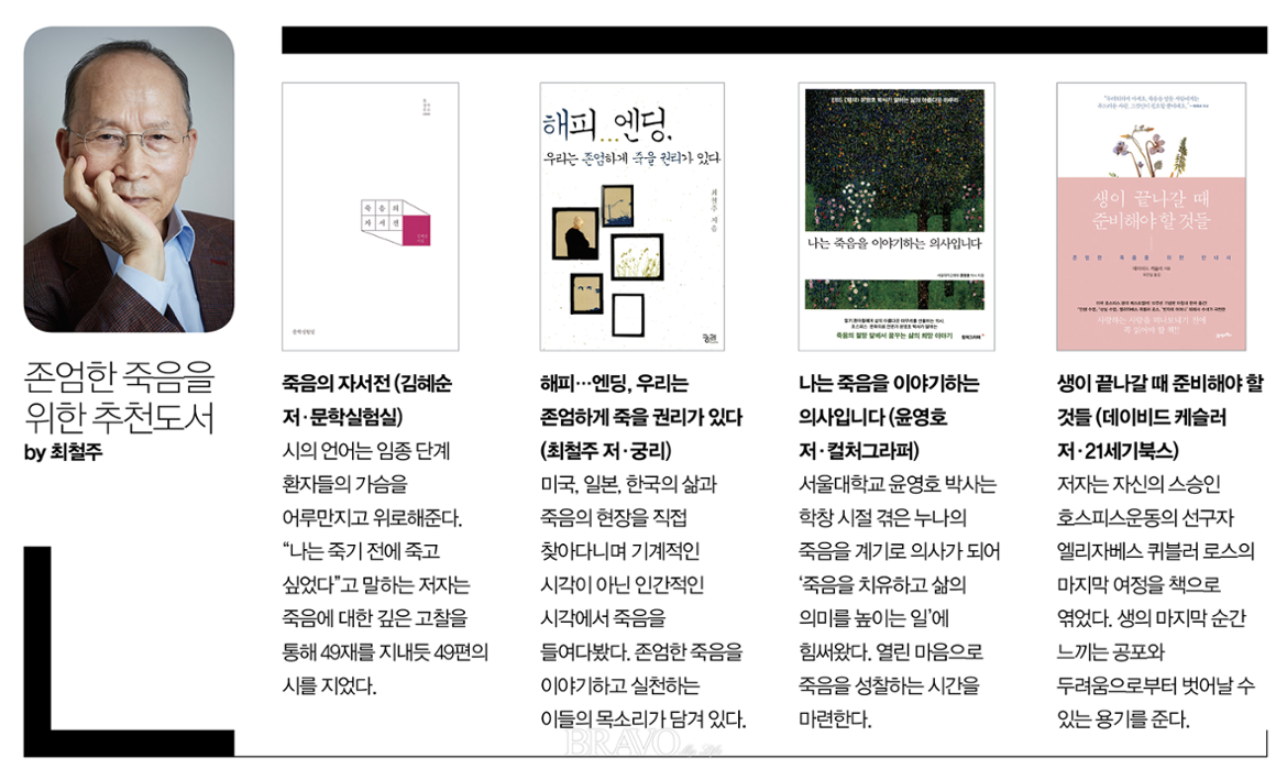호스피스 완화의료 및 임종 과정에 있는 환자의 연명의료 결정에 관한 법률, 이른바 ‘웰다잉법’이 2018년 2월부터 시행된다. ‘죽음’과 관련한 법인 만큼 제정 단계에서 주목을 받았지만, 정작 시행을 수개월 앞둔 현재, 나라 안팎의 혼란과 희석되며 이에 대한 관심이 흐려졌다. 그러나 이대로 손을 놓고 있을 수만은 없는 상황. 그동안 글과 강연을 통해 ‘웰다잉’을 알렸던 최철주의 목소리가 더욱 높아졌다.