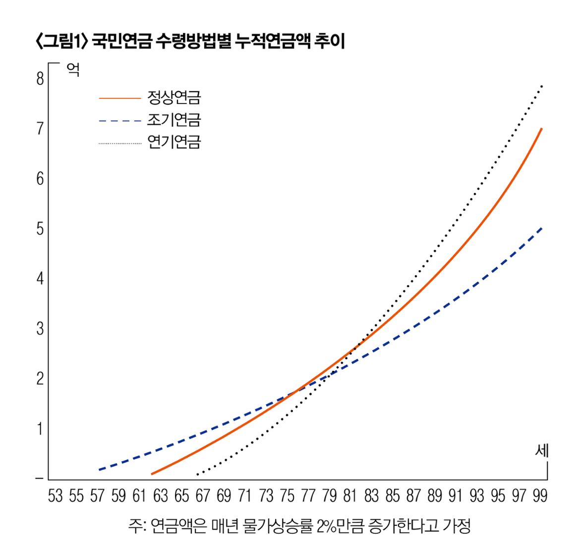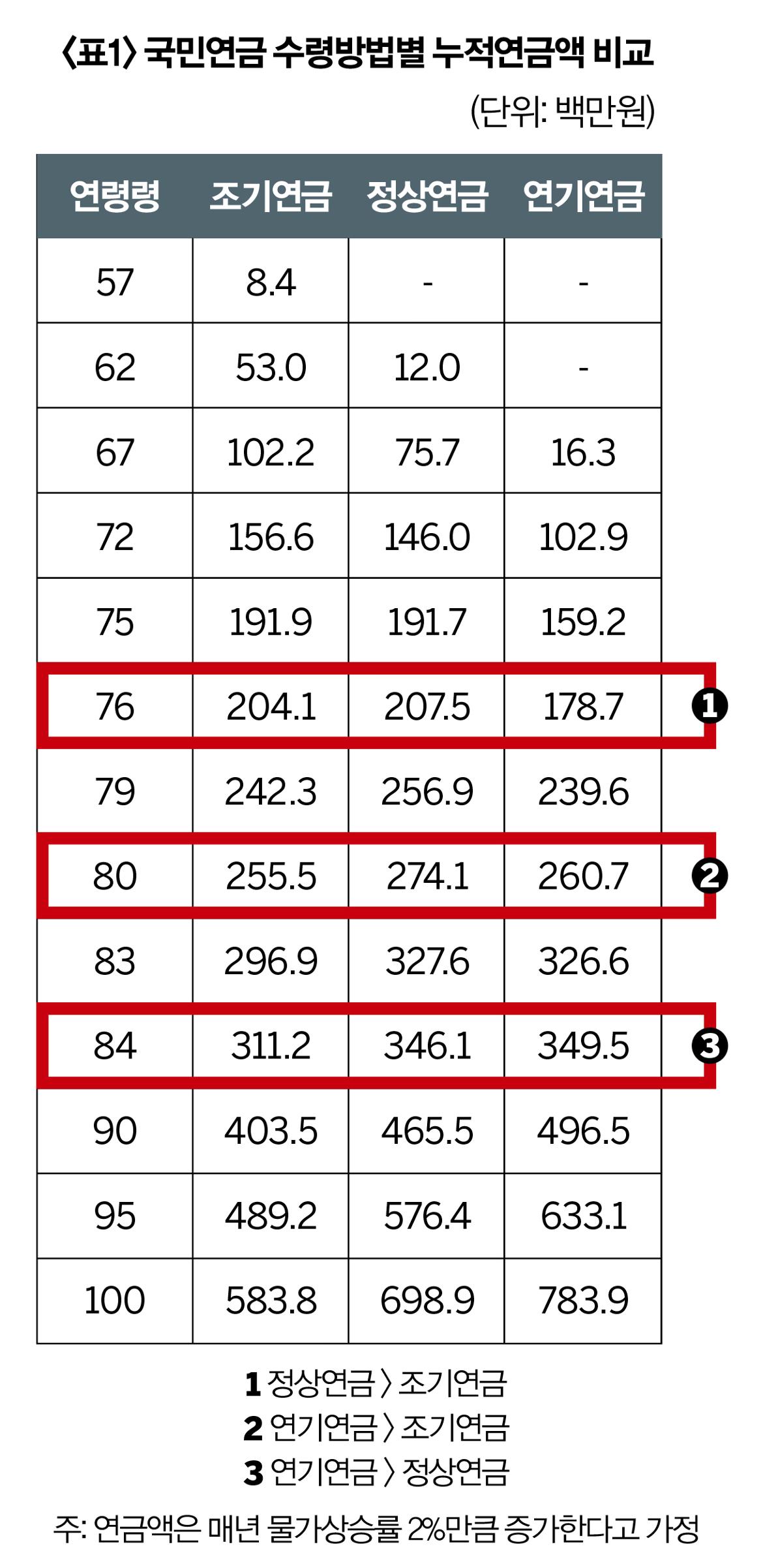 어떤 수령 방법이 가장 유리한지는 누적연금액을 비교해보면 알 수 있다. <그림1>에서 보는 바와 같이 누적연금액 곡선의 기울기가 가장 가파른 것은 연기연금이고, 그 다음이 정상연금이다. 이는 일정 기간이 지나면 정상연금의 누적연금액이 조기연금의 누적연금액을 초과하지만, 연기연금의 누적연금액에게는 추월당함을 의미한다. 정상연금 월 100만원과 이 연금액이 매년 물가상승률(2% 가정)만큼 증가한다고 했을 때 76세가 되면 정상연금의 누적연금액이 조기연금의 누적연금액보다 많아지고, 80세가 되면 10년 늦게 시작한 연기연금의 누적연금액이 조기연금의 누적연금액을 추월하며, 84세가 되면 연기연금의 누적연금액이 정상연금의 누적연금마저 넘어서게 된다(<표1> 참조). 이는 84세 말까지 생존해 있을 경우 연기연금의 누적연금액이 가장 많음을 뜻한다.