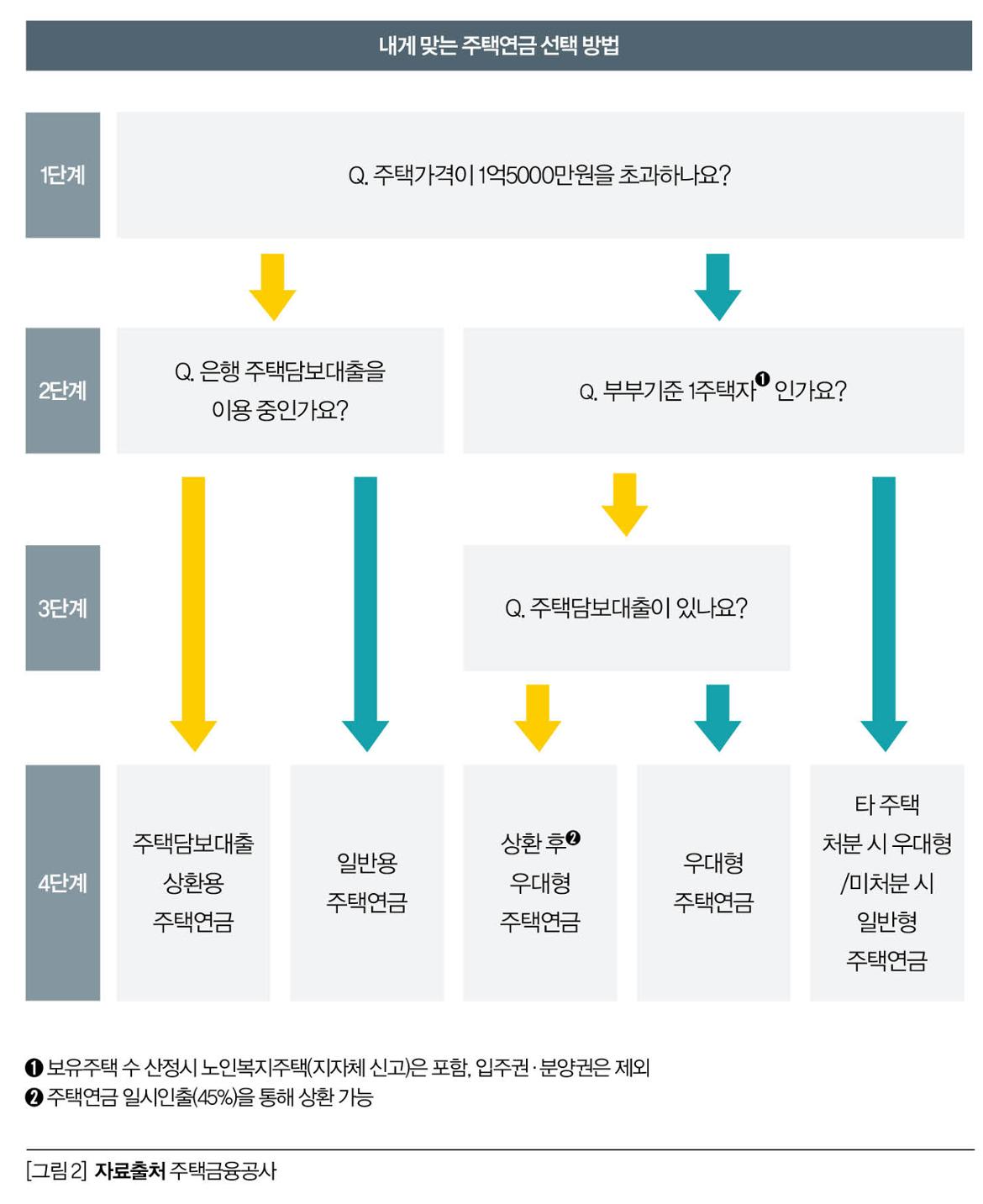 셋째, 우대형 주택연금은 부부 기준 1.5억원 이하의 1주택 보유 고령자의 노후생활비 지원을 위한 연금상품으로 일반 주택연금보다 월 지급금이 8~15% 정도 많다. 대출한도의 45% 이내에서 필요에 따라 수시인출을 할 수 있는 것도 이 상품의 장점 중 하나다. 기존 주택담보대출이 대출한도 45%를 초과하는 경우에는 자기자금으로 초과하는 금액을 상환한 뒤 우대형 주택연금에 가입할 수 있다. 자기자금이 부족할 경우에는 주택담보대출 상환용 주택연금을 활용하는 것도 한 방법이다. 이 상품의 초기보증료는 주택가격의 1.5%, 연보증료는 연금지급 총액의 0.75%다. 주택연금 종료 사유는 앞의 두 상품과 동일하다.