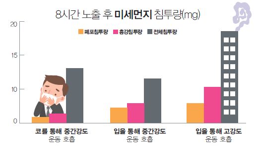 초미세먼지는 워낙 작아 폐포까지 내려간다고 알려져 있다. 그러나 그래도 입이 아닌 코로 숨을 쉬면 확실히 많이 걸러진다. 프랑스 국립직업병연구소에서 1993년 발표한 자료를 보자. 미세먼지가 폐 등 흉강에 침투한 양과 폐포까지 내려가 쌓인 양을 운동 강도와 호흡 방식에 따라 비교했다. 동일한 중간 강도의 운동을 할 경우 코로 숨 쉴 때보다 입으로 숨 쉴 때 서너 배 이상 많은 미세먼지가 폐포까지 내려가 쌓이는 것으로 드러났다.