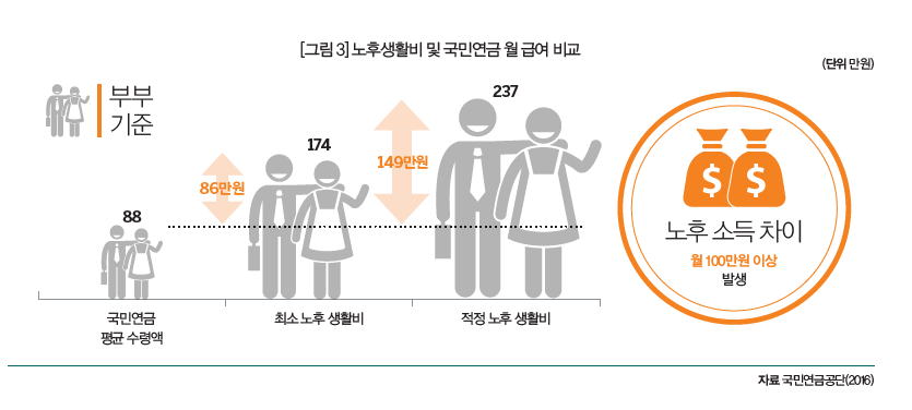 국민연금은 가입시기와 가입기간, 연금 보험료 수준에 따라 수령 금액이 달라진다. 대부분의 5060세대는 국민연금 가입 기간이 20년을 넘을 것이다. 국민연금공단에 따르면, 국민연금에 20년 이상 가입한 이들의 평균 수령금액은 88만원 수준이다. 하지만 88만원은 부부 기준 최소 노후생활비의 절반 정도에 불과하다([그림3] 참조). 국민연금으로 이 갭(gap)을 줄일 수 있는 방법은 없을까?