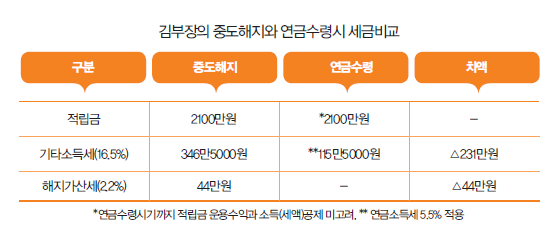 김부장이 만약 중도에 연금저축을 깨면 총 적립금 2100만원에 대한 기타소득세 16.5%(346만5000)와 해지가산세 44만원(2000만원×2.2%)을 동시에 부담해야 한다. 김 부장이 연금저축 해지로 받게 되는 금액은 원금(2000만원)의 85% 수준인 1709만5000원에 불과하다. 그러나 만약 김 부장(52)이 55세 이후부터 연금으로 10년간 나누어 인출하게 되면 약 275만원의 세금을 줄일 수 있다.