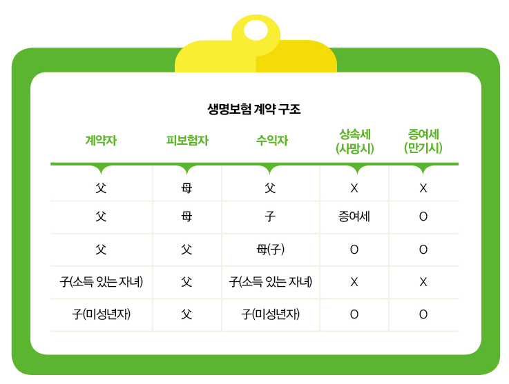 강남의 부자들이 거액의 상속세 납부재원을 준비하기 위해 효과적으로 활용하는 방법이 생명(종신)보험이다. 생명보험은  대적으로 저렴한 비용으로 상속세 재원을 마련할 수 있다는 점에서 활용 폭이 커지고 있다. 하지만 계약구조(표 참조)에 따라 생명보험금이 상속재산에 포함되는 경우와 포함되지 않은 경우로 나눌 수 있기 때문에 주의할 필요가 있다.