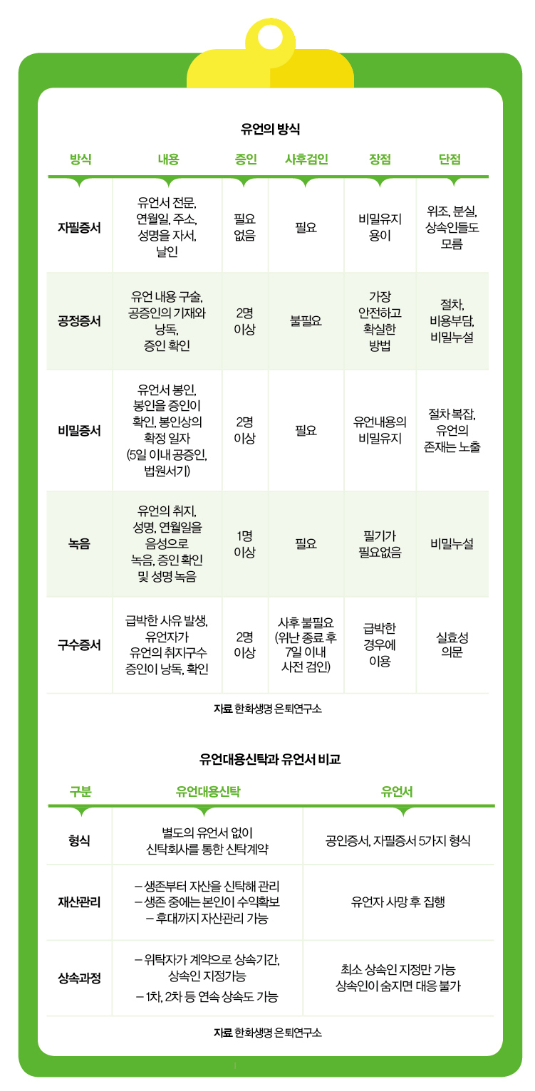 이처럼 유언의 까다로운 요건 때문에 최근에는 유언대용신탁을 활용하는 사례가 늘어나고 있다. 유언대용신탁은 가입자가 살아 있을 때는 자산을 운용해 수익을 돌려주고, 사후에는 상속인에게 재산을 이전하는 신탁상품이다. 그리고 살아생전에 재산을 분할함으로써 상속재산의 원만한 분배로 사망 후 재산분할에 관한 분쟁을 방지하고, 미성년자나 장애를 가진 상속인의 상속재산도 보존이 가능하며, 유언서 작성 및 복잡한 법적 상속 절차를 생략할 수 있다는 점에서 활용 폭이 점점 커지고 있다.