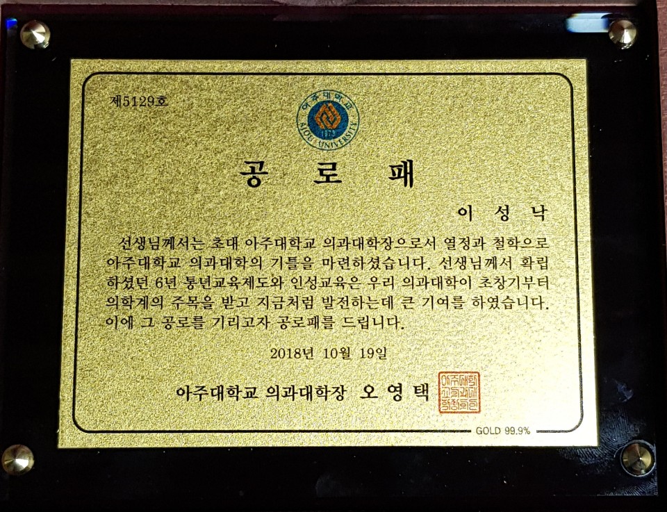 ▲ 아주대학교 의대 개교 30주년 공로패.