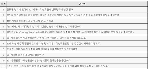 재단은 50+세대가 그동안 축적해온 소중한 경험과 지식들을 바탕으로 적극적인 활동과 역할을 할 수 있도록 ‘50+당사자연구 공모사업’을 실시하고 있다. 이 공모사업은 50+세대의 시선으로 현장 중심의 이슈를 스스로 발굴하고 체감도 높은 정책 대안을 제시하는 50+당사자 연구사업이다.