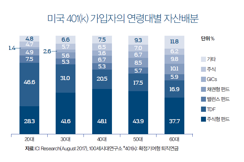 미국 401(k) 사례로 볼 때 TDF는 은퇴까지의 기간이 많이 남은 20~30대가 가입하는 게 유리하다. 그러나 정년까지 10년 정도 남은 50대도 생애주기에 따라 글로벌 자산 배분을 하는 TDF의 장점을 누릴 수 있다. 다만 60대 이상은 70세 이후까지 일하는 경우에 한해 가입을 권한다.
