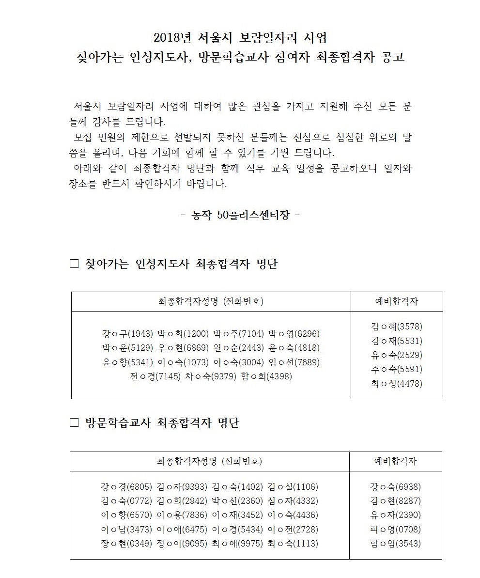 [동작]2018년 보람일자리사업 '찾아가는 인성지도사','방문학습교사'참여자 최종합격자 공고