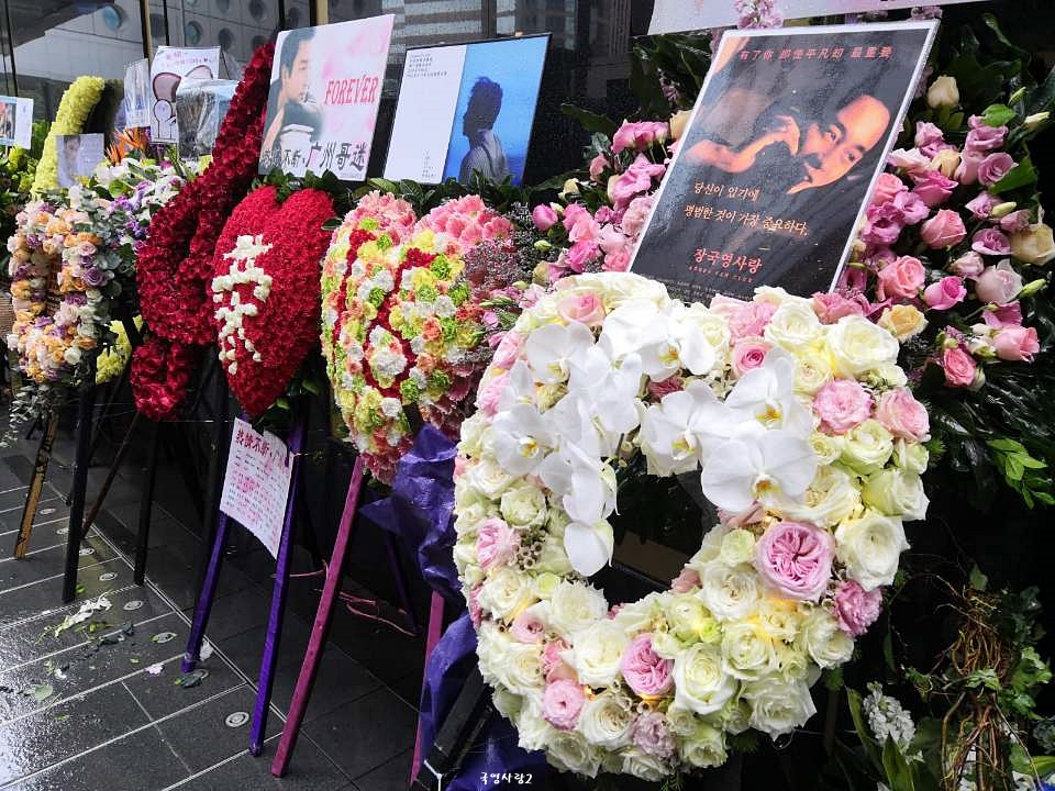 추모 당일 홍콩 날씨는 비가 오락가락 하면서 변덕스럽습니다. 이에 밤새 불침번을 서며 꽃을 지키고 다음 날 일터로 바로 출근하는 홍콩팬클럽도 있었습니다. 이러한 친구들의 희생 덕에 꽃들은 밤새 잘 보존되었습니다.