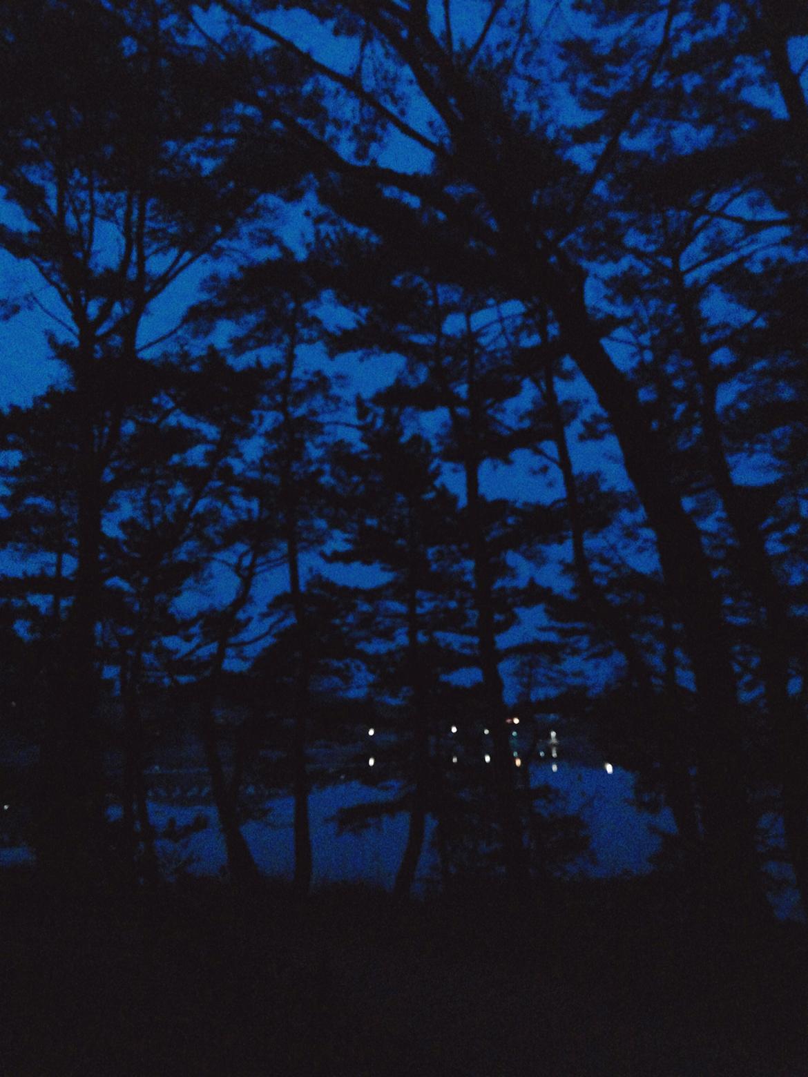 어둠이 깃든 충무사 근처의 이순신 장군 가매장터 소나무 숲