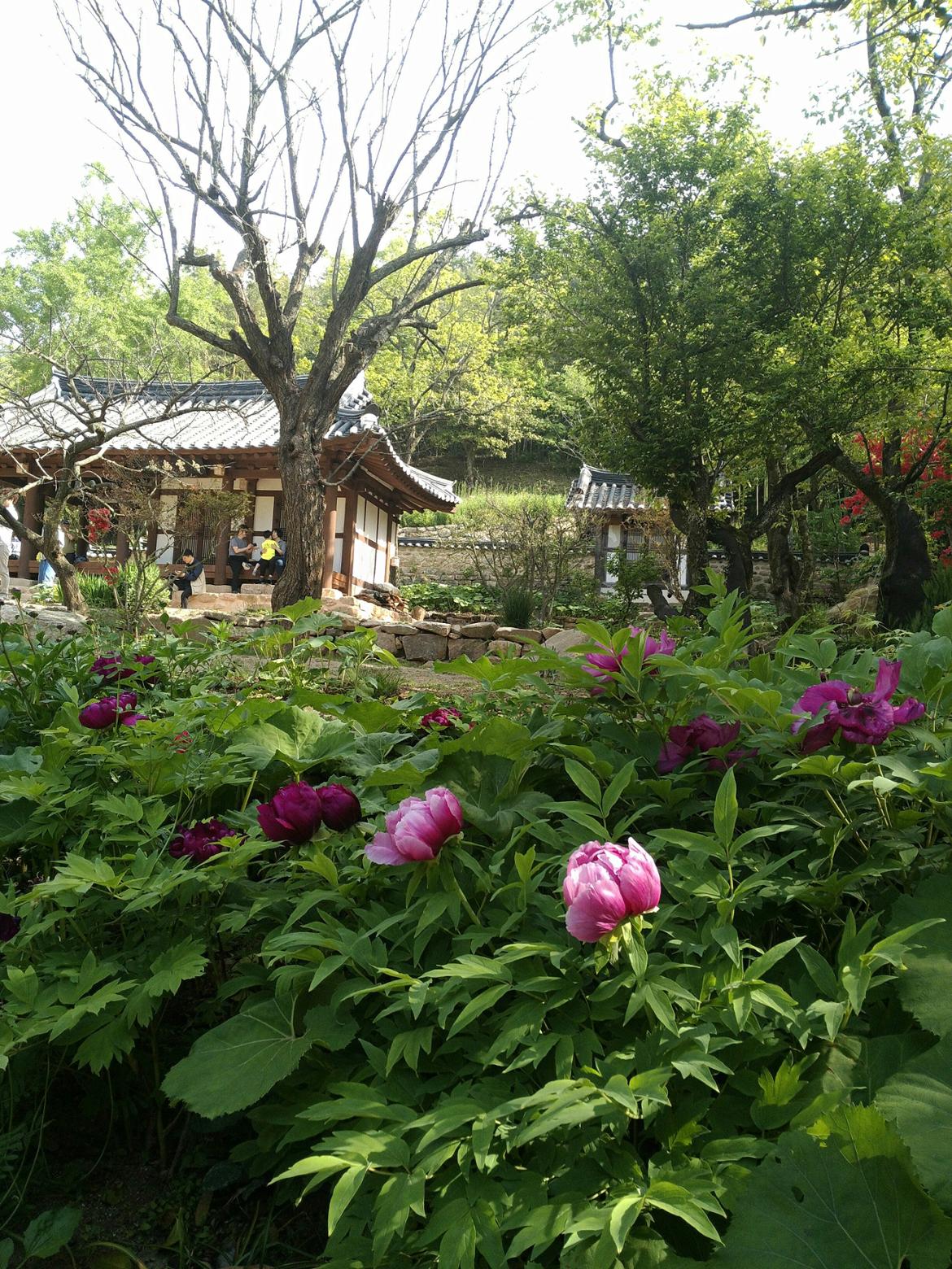 건물 벽에 누군가 월출산과 원림을 그려놓았다.                                       화단 가득한 모란과 작약꽃