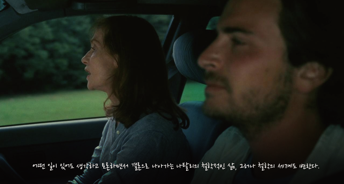 여주인공의 독백이나 다짐 같은 헤드 카피 ‘지금껏 잘 살아왔고 앞으로도 잘 살아갈 거예요’ 중에서 ‘지금껏 잘 살아왔고’의 내용으로 들어가 보자. 오프닝 장면에서의 나탈리(이사벨 위페르)는 아직 젊다. 미래에 무엇이 닥쳐올지 모르지만 큰 관심도 걱정도 없다. 딸 하나, 아들 하나는 아직 어려서 엄마 아빠의 여행에 그저 동행했을 뿐이다. 철학교사인 나탈리는 여행지에 도착하고 나서도 배안에서 학생들이 써낸 리포트를 살펴보고 있다. 리포트의 주제는 ‘남의 입장을 이해하는 것은 가능한가?’ 빼곡하게 써낸 학생의 페이퍼에 AA를 체크하고 나탈리는 파도가 밀려오는 바다로 나간다.