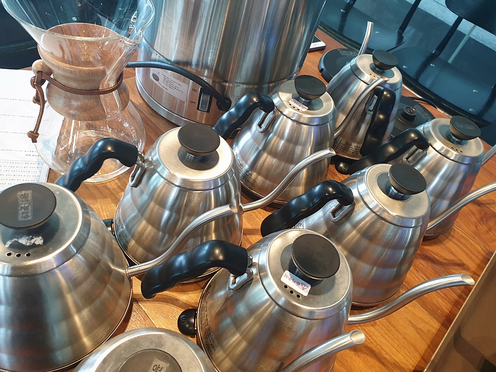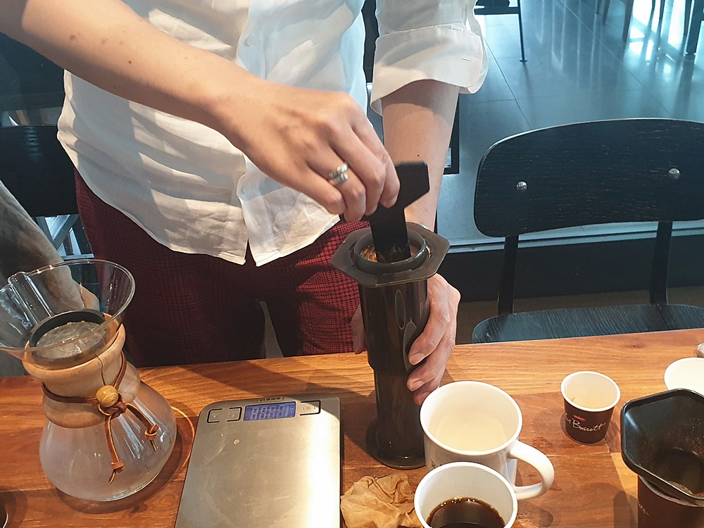 마치 과학 실험실을 방불케 했는데요. 에어로프레스를 이용해서 커피를 추출하면 커피 맛이 내린 사람에 따라 크게 달라지지 않는다고 합니다.