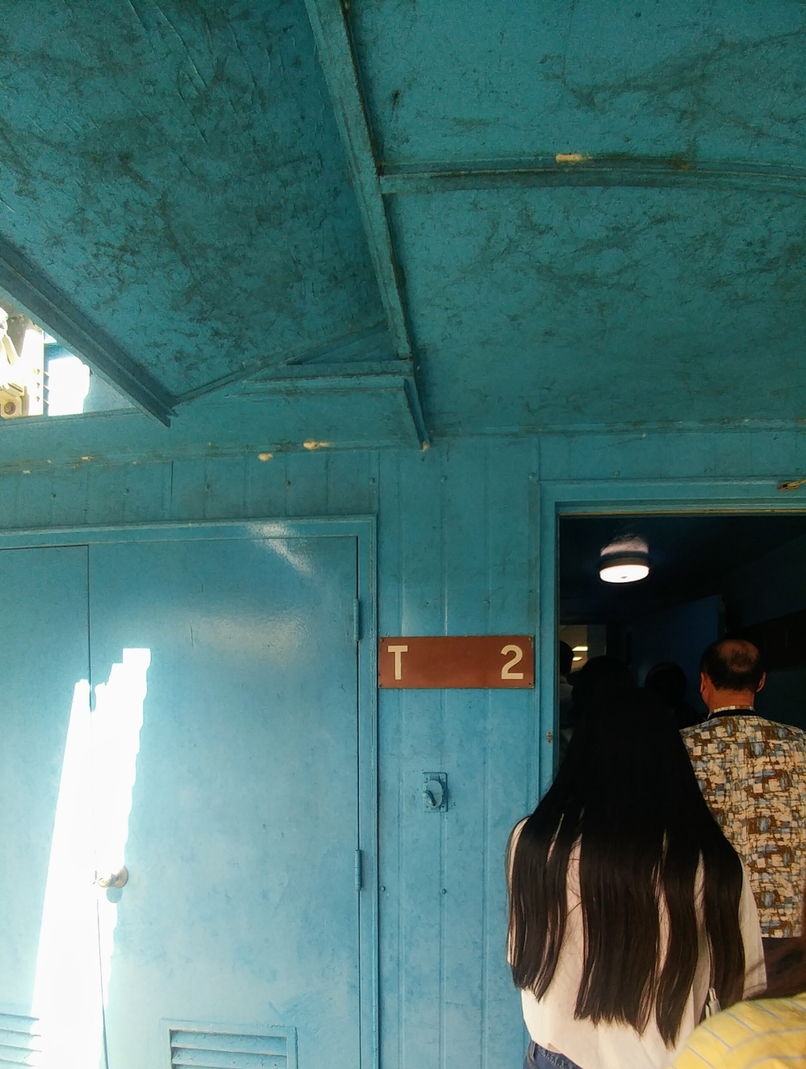 T2회담장(정식명칭: 군사정전위원회 본회의실)내부는 3~4평 남짓한 공간에 2-3개의 테이블이 가로 세로로 의자와 함께 배치되어 있었다. 대형 테이블 중앙은 군사분계선이 지나는 지점으로 두서너 군데의 케이블 slot 사이로 책상 밑에서 끌어올린 케이블로 장착된 마이크수신기가(정확한 명칭은 모르겠다) 책상 위에 덩그러니 놓여있는 모습에 눈길이 쉽게 떼어지지 않았다.