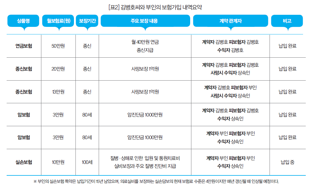 암보험은 보장기간이 80세인 점이 좀 아쉽다. 부인이 가입하고 있는 실손보험의 특약에는 암이나 뇌졸중, 그리고 심근경 색과 같은 주요 질병에 대한 진단비가 포함되어 있지만 김병호씨의 경우는 퇴직으로 인해 질병이나 상해에 대한 보장을 받을 수 없기 때문에 늦기 전에 월 보험료 10 만원 수준에 100세까지 보장받을 수 있는 실손담보를 포함한 건강보험에 가입할 것을 권한다.