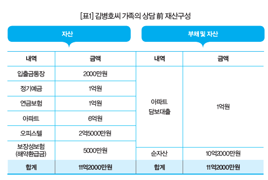 김병호씨의 가족으로는 전업주부인 배우자(56세)와 현재 직장인 큰아들(29세), 올해 대학을 졸업하고 취업을 준비하고 있는 작은아들(26세)이 있다. 김병호씨의 현재 재무상황은 아래([표1], [표2])와 같으며 퇴직을 하면 약 2억2000 만원의 퇴직금이 예상된다. 김병호씨 가정의 현재 생활비는 매월 30만원의 대출이자를 포함해 350만원 정도가 지출되고 있으며, 취업한 큰아들이 매월 50만원의 생활비를 보조하고 있다. 대출을 전액 상환하고 자녀들이 모두 독립하면 가계생활비는 220만원 전후로 예상된다.