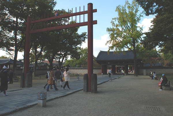 경기전의 홍살문과 정전 입구                                                                                                       경기전의 정전. 조선의 태조인 이성계의 어진이 모셔져 있다.