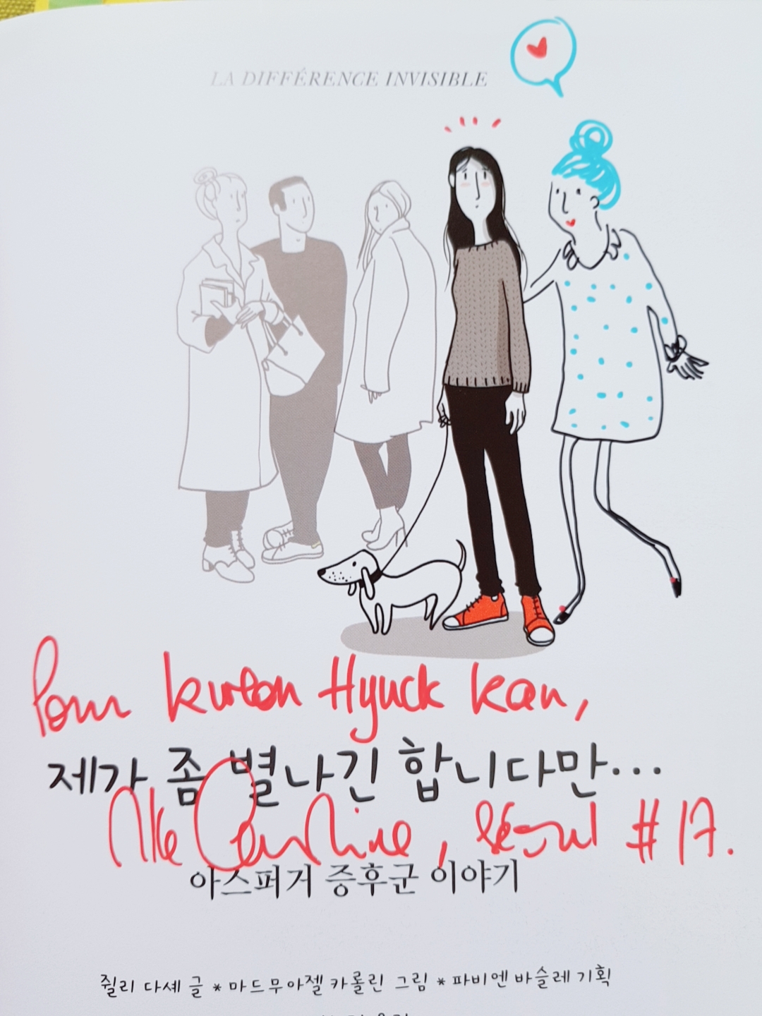 ‘아스퍼거 증후군 이야기’라는 부제의 그래픽 노블 <제가 좀 별나긴 합니다만...>의 원제목은 <LA DIFFEERENCE INVISIBLE>이다. 안 보이는 다름, 보이지 않는 다름이 ‘별난’으로 번역되었다. 글을 쓴 쥘리 다셰는 아스퍼거 자폐증을 앓는 사람이고 그림을 그린 마드무아젤 카롤린은 세 차례의 심각한 우울증을 겪은 사람이다. 이 두 사람은 ‘정상’이라는 것에 대한 신념의 횡포를 용납할 수 없는 당신에게 이 책을 바친다고 했다. 당신은 치료받을 필요도, 변해야 할 필요도 없다고도 말했다.