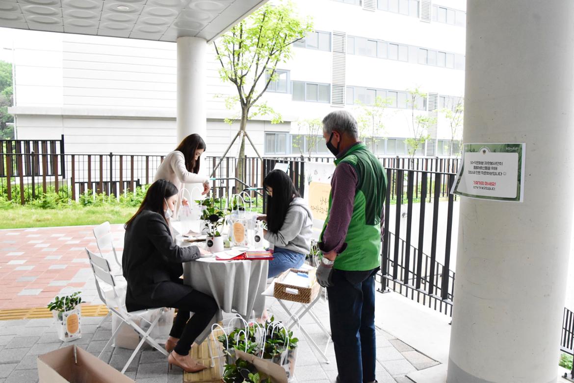 화분 수거가 시작되자 작은화분들이 옹기종기 모여들기 시작했습니다. 작은화분들이 모이는 날인걸 아는지,  날씨도 선선하게 도와주던 싱그러운 날이었습니다. 양손 가득 작은화분을 들고 오는 씩씩한 50+세대들. 마스크 너머로도 보람찬 표정을 느낄 수 있었는데요. 화분 2개를 예쁘게 만들고, 캠퍼스까지 가지고 와야하는 번거로움이 있음에도 기쁘게 신청하셨을 50+자원봉사자들의 예쁜마음. 50+덕분에 남부캠퍼스는 벅차고 감사한 마음이 들었습니다.