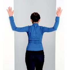 어깨가동범위를 확인했다면, 아래 순서대로 운동하고 자기평가를 통해 가동범위 변화를 확인해가면서 운동횟수와 강도를 조절해 나가야 한다. 어깨관절의 팔올림 기능은 관절주머니의 유연성을 회복하는 것에 달렸다. 어깨관절 팔올림 기능을 회복하기 위한 첫 번째 운동은 가슴펴기다.(그림3) 문지방에 서서 양쪽 문틀에 양팔을 벌려 어깨높이로 팔꿈치를 위치한 후 앞쪽에 위치한 무릎을 구부리면서 체중을 앞으로 쏠리며 가슴의 대흉근을 스트레칭한다. 이 동작을 5초간 5회 반복한다.
